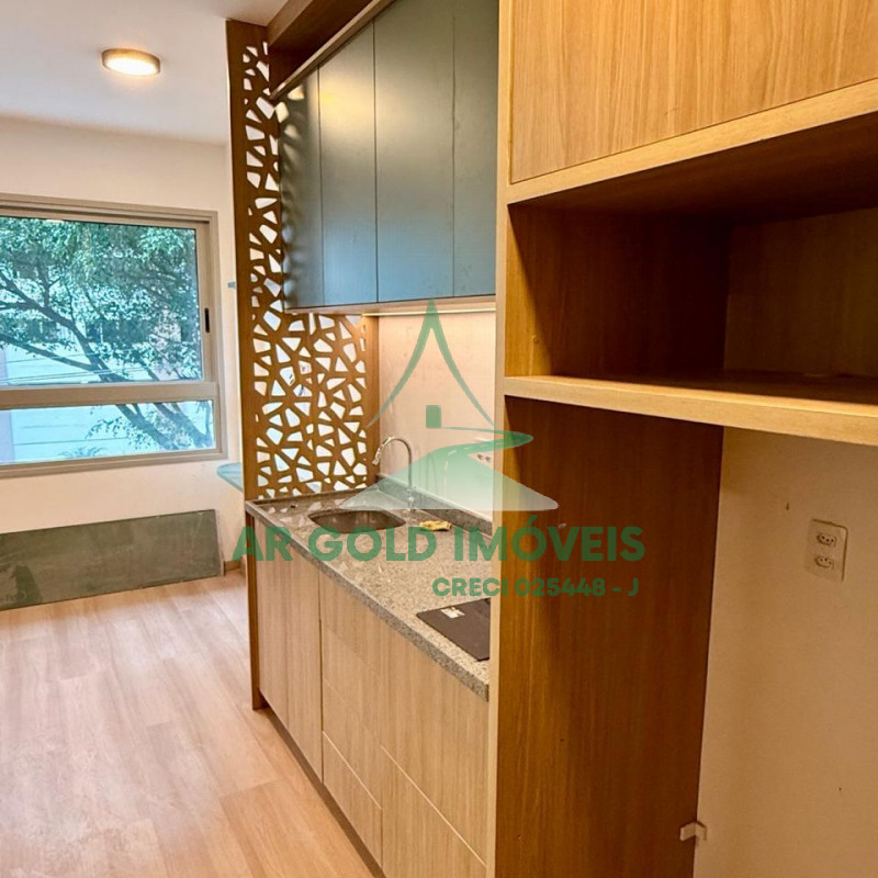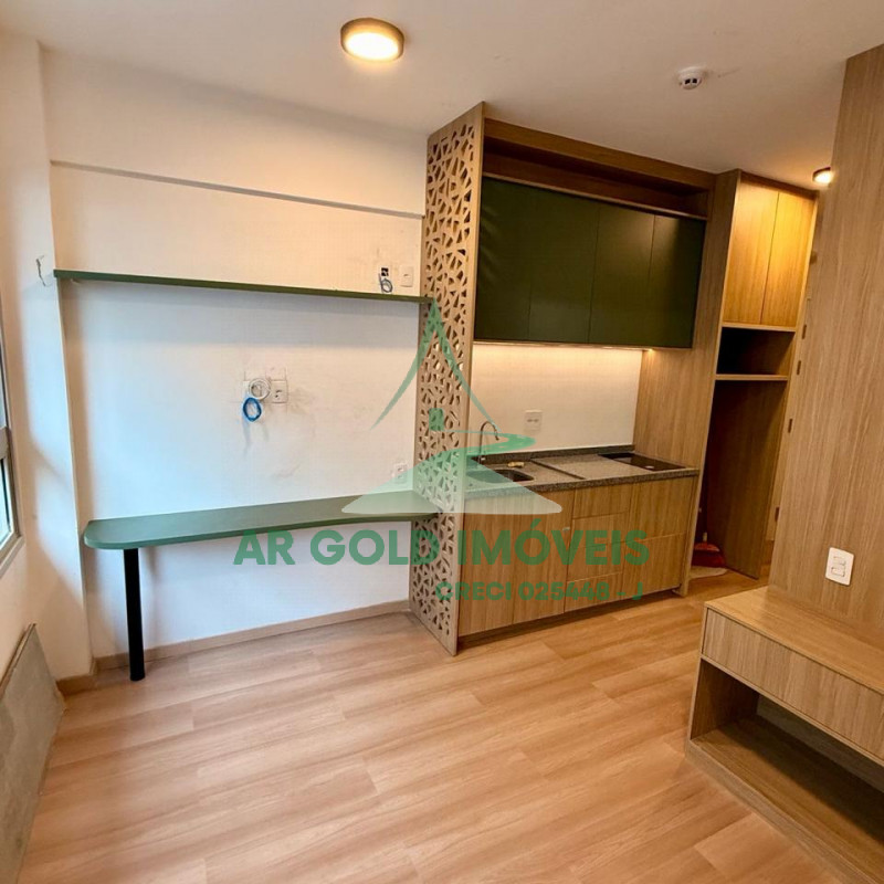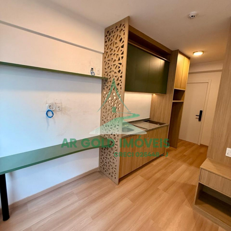 Com 21m² de área útil, o imóvel é compacto, funcional e muito bem aproveitado, com gabinetes instalados em todo o apartamento, pronto para uso.